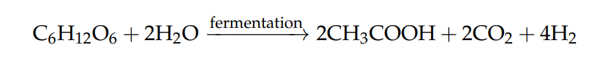 تخمیر یکی دیگر از مسیرهای بیولوژیکی برای تولید هیدروژن است که شامل تبدیل مواد آلی توسط میکروارگانیسمها در محیطهای بیهوازی میشود. پسماندهای کشاورزی مانند کاه و کود و محصولات جانبی صنعتی مانند ویناس، سرشار از مواد آلی هستند. باکتریهای کلیدی تولیدکننده هیدروژن شامل کلستریدیوم، انتروباکتر و کلبسیلا هستند. در طول این فرآیند، باکتریهای تخمیرکننده کربوهیدراتهایی مانند گلوکز را تجزیه میکنند و محصولات جانبی مانند اسیدهای آلی، دیاکسید کربن و هیدروژن مولکولی تولید میکنند. واکنش کلی برای تخمیر گلوکز برای تولید هیدروژن را میتوان با معادله (۸) نشان داد.